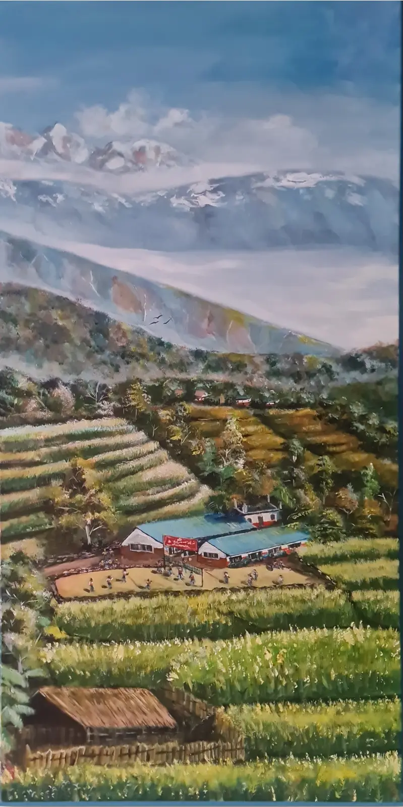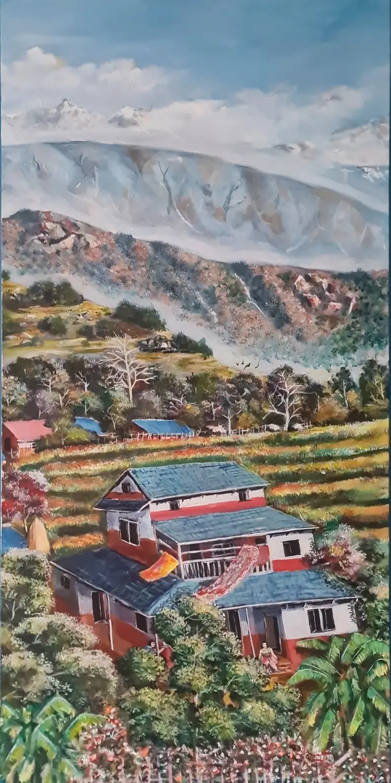This is a big acrylic painting on canvas which is nestled in the western part of Nepal, there is a picturesque village that lies in the enchanting shadow of the renowned Fishtail Mountain. This village, a hidden gem, is blessed with a natural beauty that captivates the hearts of all who venture there.