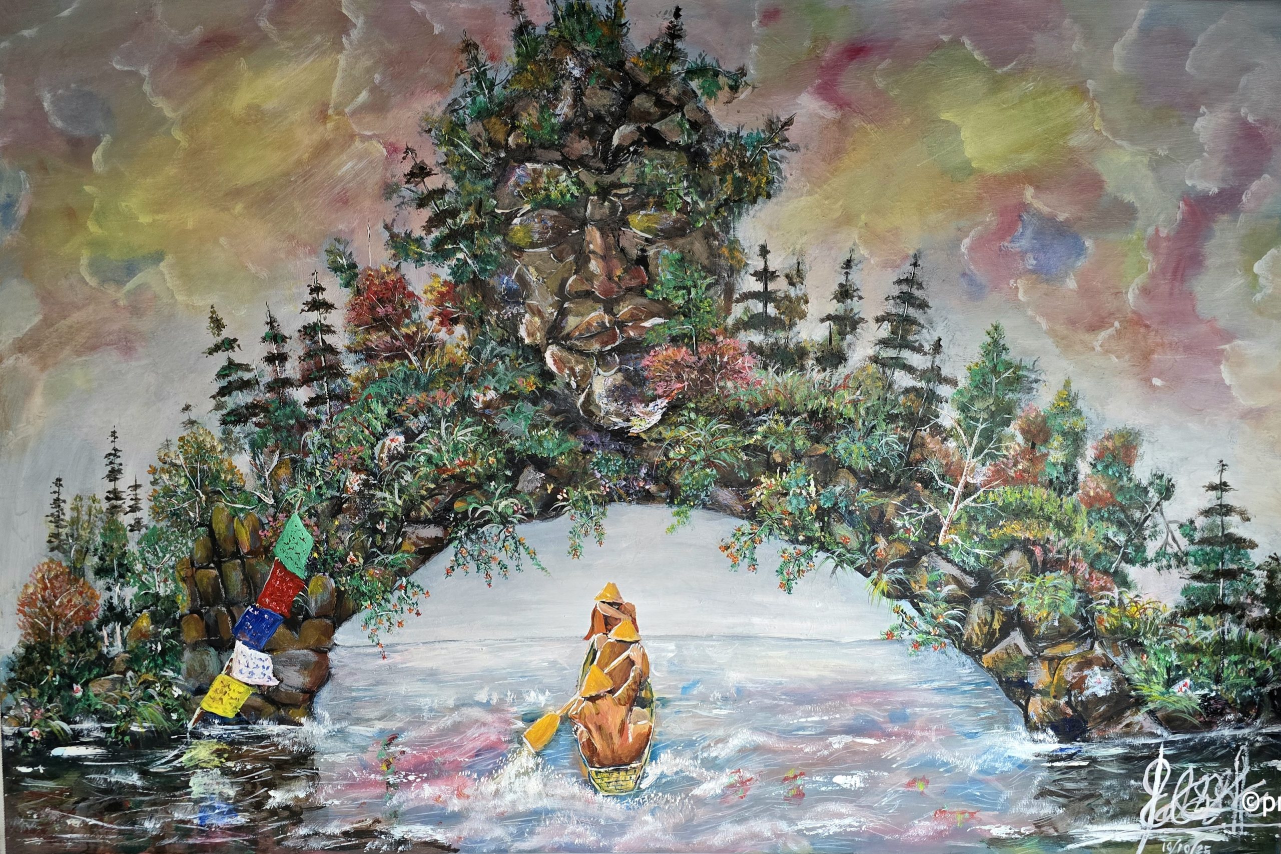 A family here in UK is quite a big fond of Buddha and his simplicity, their house is covered with full of Buddhist gifts and signs, so they wanted me to create one for them to add-up onto theirs. It was very big canvas, where I painted a glimpse of disturbed and attentive shape with rowing boat by three monks. These all illustrated a violent scenario, peaceful remarks of Buddha and motivated monks all in one frame.